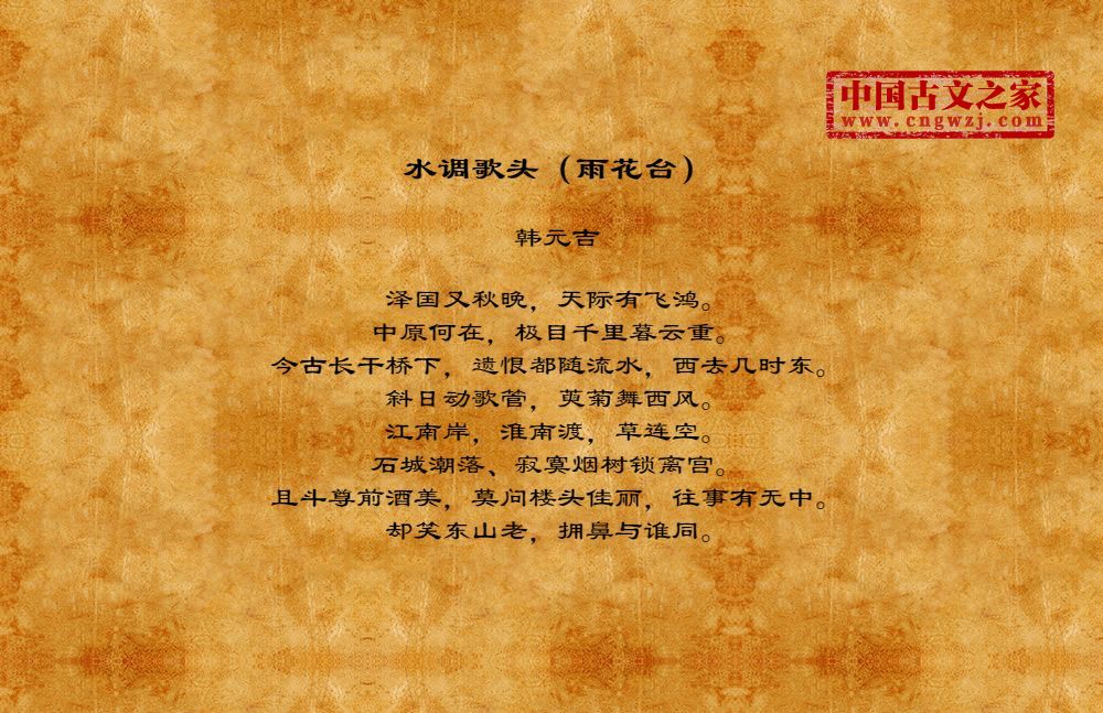 泽国又秋晚,天际有飞鸿。中原何在,极目千里暮云重。今古长干桥下,遗恨都随流水,西去几时东。斜日动歌管,萸菊舞西风。江南岸,淮南渡,草连空。石城潮落、寂寞烟树锁离宫。且斗尊前酒美,莫问楼头佳丽,往事有无中。却笑东山老,拥鼻与谁同。