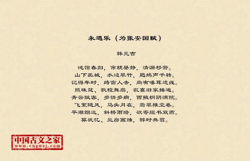 池馆春归,帘栊昼静,清漏移箭。山下孤城,水边翠竹,鶗鴂声千转。记得年时,绮窗人去,尚有唾茸遗线。照珠筵、歌檀舞扇,寂寞旧家排遍。青云赋客,多情多病,西掖桐阴满院。飞絮随风,马头月在,翡翠帷空卷。平湖烟远,斜桥雨暗,欲寄短书双燕。算犹忆、兰房画烛,醉时共翦。