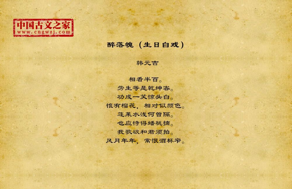 相看半百。劳生等是乾坤客。功成一笑惊头白。惟有榴花,相对似颜色。蓬莱水浅何曾隔。也应待得蟠桃摘。我歌欲和君须拍。风月年年,常恨酒杯窄。
