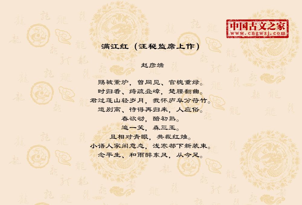 赐被薰炉,曾同见、官槐重绿。时归看、绮疏叠嶂,楚腰翻曲。君过蓬山轻岁月,我怀庐阜分符竹。道别离、待得再归来,人应俗。春欲动,醅初熟。追一笑,森三玉。且相对青眼,共裁红烛。小语人家闲意态,浅寒都下新装束。念平生、和雨醉东风,从今足。