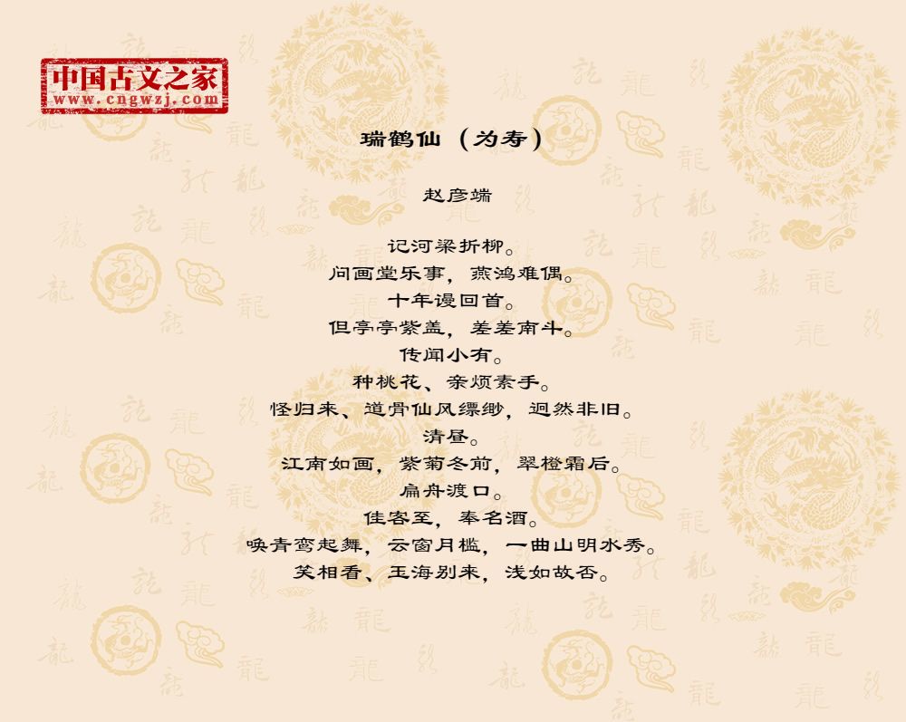 记河梁折柳。问画堂乐事,燕鸿难偶。十年谩回首。但亭亭紫盖,差差南斗。传闻小有。种桃花、亲烦素手。怪归来、道骨仙风缥缈,迥然非旧。清昼。江南如画,紫菊冬前,翠橙霜后。扁舟渡口。佳客至,奉名酒。唤青鸾起舞,云窗月槛,一曲山明水秀。笑相看、玉海别来,浅如故否。