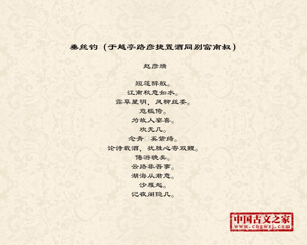 《垂丝钓(于越亭路彦捷置酒同别富南叔)》由赵彦端创作