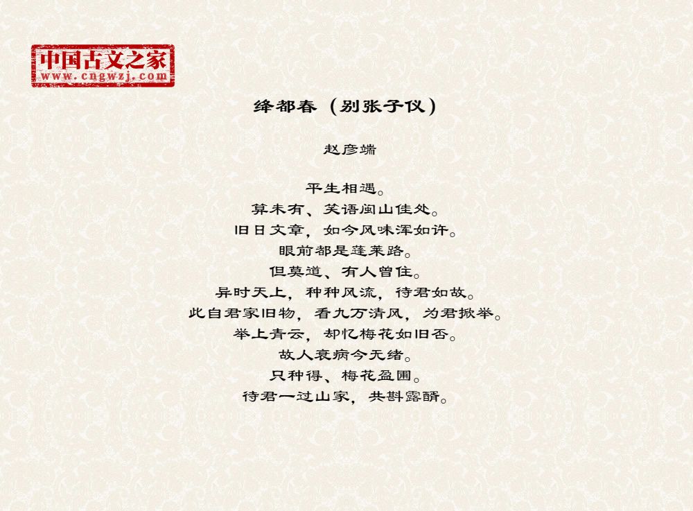 平生相遇。算未有、笑语闽山佳处。旧日文章,如今风味浑如许。眼前都是蓬莱路。但莫道、有人曾住。异时天上,种种风流,待君如故。此自君家旧物,看九万清风,为君掀举。举上青云,却忆梅花如旧否。故人衰病今无绪。只种得、梅花盈圃。待君一过山家,共斟露醑。