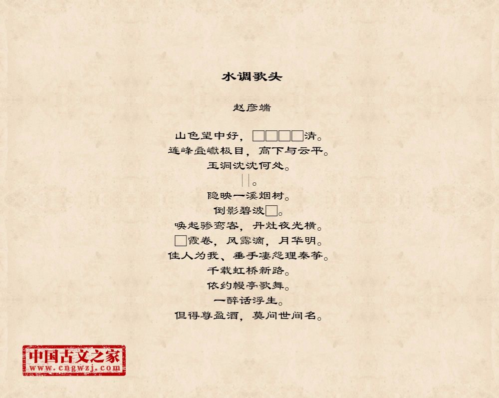 山色望中好,□□□□清。连峰叠巘极目,高下与云平。玉洞沈沈何处。||。隐映一溪烟树。倒影碧波□。唤起骖鸾客,丹灶夜光横。□霞卷,风露滴,月华明。佳人为我、垂手凄怨理秦筝。千载虹桥新路。依约幔亭歌舞。一醉话浮生。但得尊盈酒,莫问世间名。