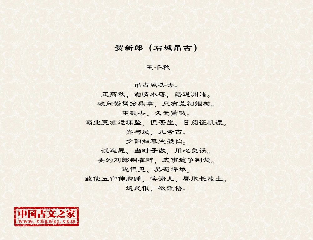 吊古城头去。正高秋、霜晴木落,路通洲渚。欲问紫髯分鼎事,只有荒祠烟树。巫觋去、久无箫鼓。霸业荒凉遗堞坠,但苍崖、日阅征帆渡。兴与废,几今古。夕阳细草空凝伫。试追思、当时子敬,用心良误。要约刘郎铜雀醉,底事遽争荆楚。遂但见、吴蜀烽举。致使五官伸脚睡,唤诸儿、昼取长陵土。遗此恨,欲谁语。