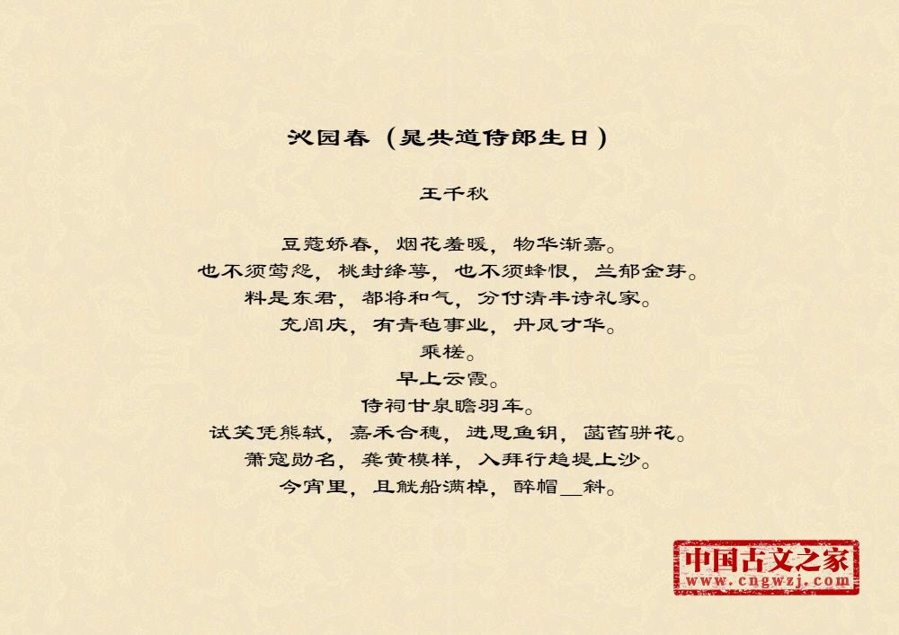 《沁园春(晁共道侍郎生日)》的原文打印版(王千秋)