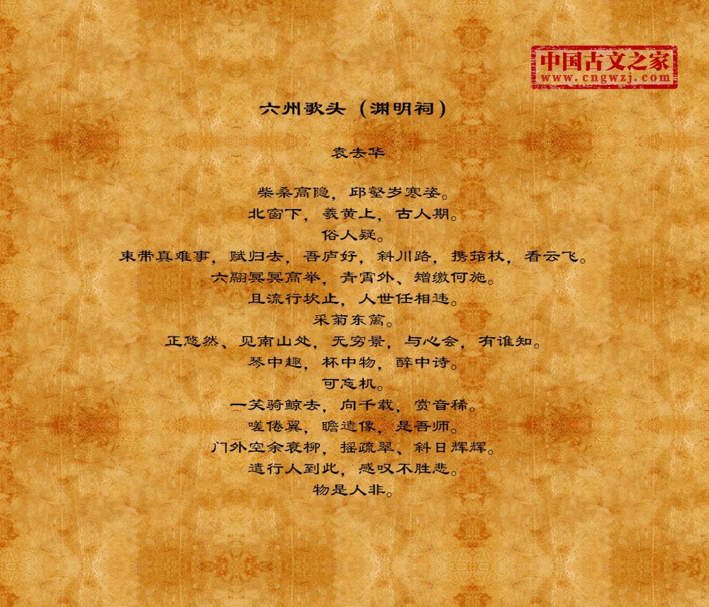 柴桑高隐,邱壑岁寒姿。北窗下,羲黄上,古人期。俗人疑。束带真难事,赋归去,吾庐好,斜川路,携筇杖,看云飞。六翮冥冥高举,青霄外、矰缴何施。且流行坎止,人世任相违。采菊东篱。正悠然、见南山处,无穷景,与心会,有谁知。琴中趣,杯中物,醉中诗。可忘机。一笑骑鲸去,向千载,赏音稀。嗟倦翼,瞻遗像,是吾师。门外空余衰柳,摇疏翠、斜日辉辉。遣行人到此,感叹不胜悲。物是人非。