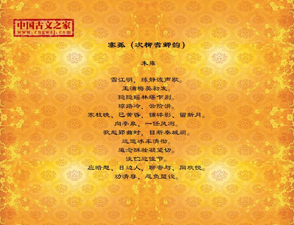 雪江明,练静波声歇。玉浦梅英初发。隐隐瑶林堪乍别。琼路冷,云阶滑。寒枝晚、已黄昏,铺碎影、留新月。向亭皋、一任风冽。歌起郢曲时,目断秦城阙。远道冰车清彻。追念酥妆凝望切。淡伫迎佳节。应暗想、日边人,聊寄与、同欢悦。劝清尊、忍负盟设。