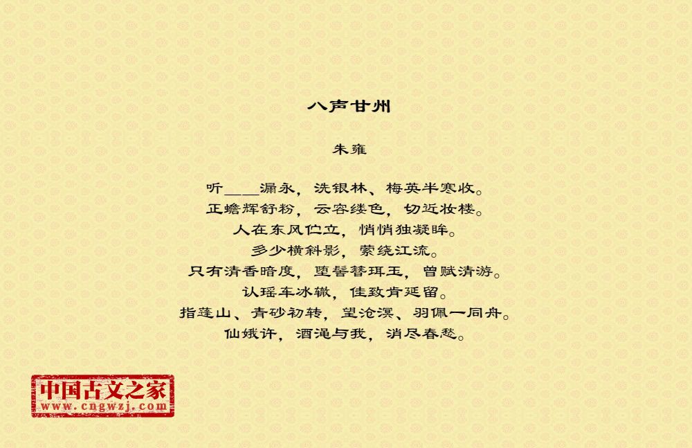 听__漏永,洗银林、梅英半寒收。正蟾辉舒粉,云容缕色,切近妆楼。人在东风伫立,悄悄独凝眸。多少横斜影,萦绕江流。只有清香暗度,堕髻簪珥玉,曾赋清游。认瑶车冰辙,佳致肯延留。指蓬山、青砂初转,望沧溟、羽佩一同舟。仙娥许,酒渑与我,消尽春愁。
