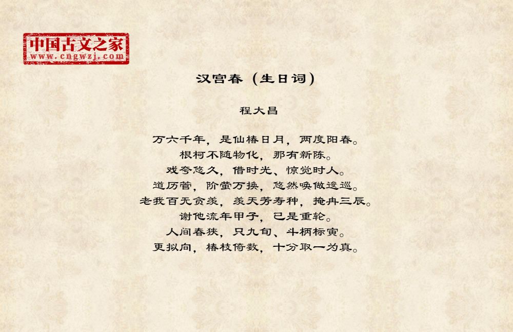 万六千年,是仙椿日月,两度阳春。根柯不随物化,那有新陈。戏夸悠久,借时光、惊觉时人。道历管,阶萤万换,悠然唤做逡巡。老我百无贪羡,羡天芳寿种,掩冉三辰。谢他流年甲子,已是重轮。人间春狭,只九旬、斗柄标寅。更拟向,椿枝倚数,十分取一为真。