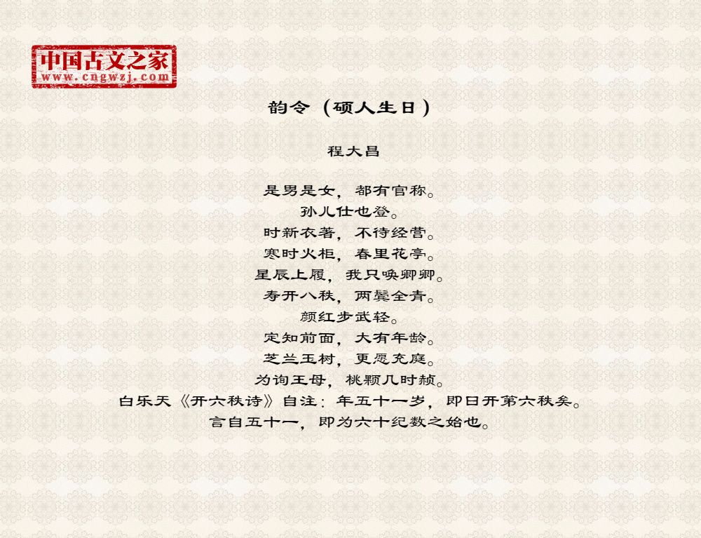 是男是女,都有官称。孙儿仕也登。时新衣著,不待经营。寒时火柜,春里花亭。星辰上履,我只唤卿卿。寿开八秩,两鬓全青。颜红步武轻。定知前面,大有年龄。芝兰玉树,更愿充庭。为询王母,桃颗几时赪。白乐天《开六秩诗》自注:年五十一岁,即曰开第六秩矣。言自五十一,即为六十纪数之始也。