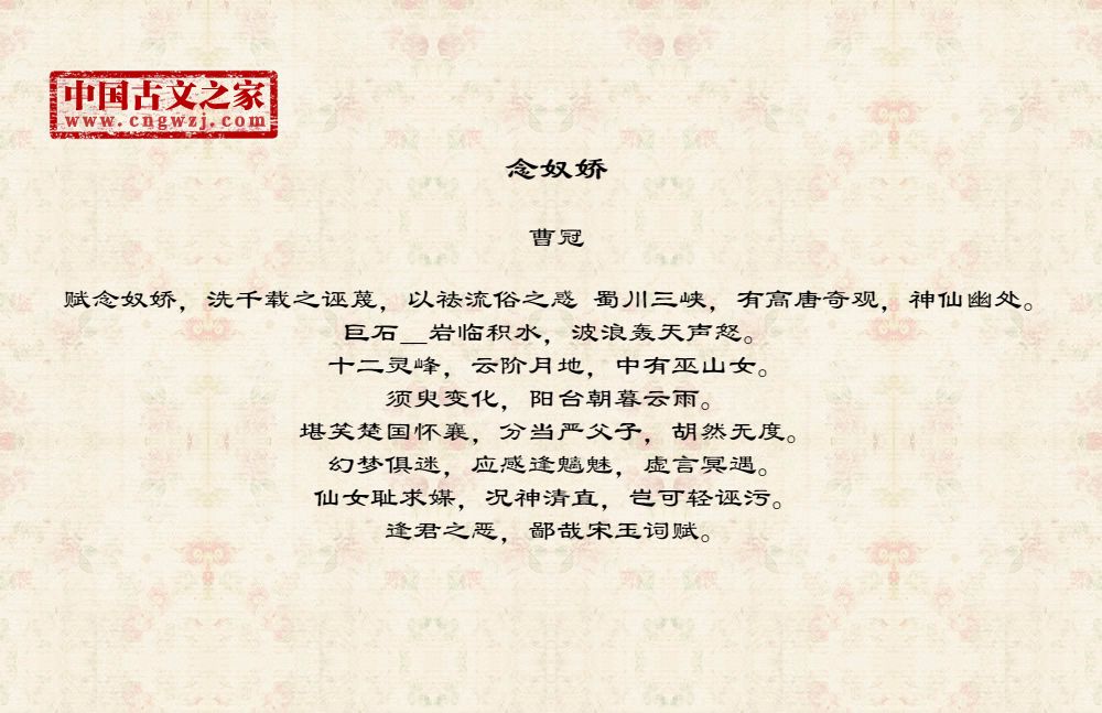 赋念奴娇,洗千载之诬蔑,以祛流俗之惑 蜀川三峡,有高唐奇观,神仙幽处。巨石_岩临积水,波浪轰天声怒。十二灵峰,云阶月地,中有巫山女。须臾变化,阳台朝暮云雨。堪笑楚国怀襄,分当严父子,胡然无度。幻梦俱迷,应感逢魑魅,虚言冥遇。仙女耻求媒,况神清直,岂可轻诬污。逢君之恶,鄙哉宋玉词赋。