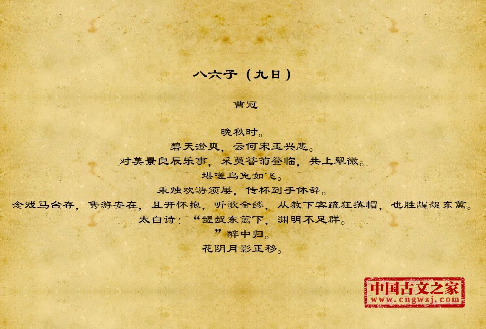 晚秋时。碧天澄爽,云何宋玉兴悲。对美景良辰乐事,采萸簪菊登临,共上翠微。堪嗟乌兔如飞。秉烛欢游须屡,传杯到手休辞。念戏马台存,隽游安在,且开怀抱,听歌金缕,从教下客疏狂落帽,也胜龌龊东篱。太白诗:“龌龊东篱下,渊明不足群。”醉中归。花阴月影正移。
