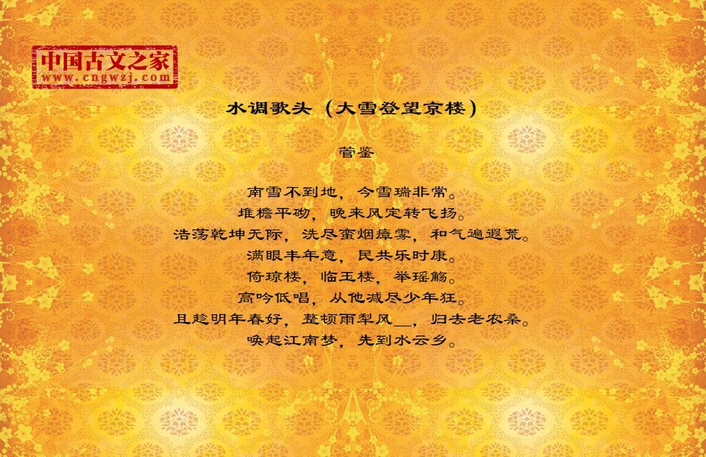南雪不到地,今雪瑞非常。堆檐平砌,晚来风定转飞扬。浩荡乾坤无际,洗尽蛮烟瘴雾,和气遍遐荒。满眼丰年意,民共乐时康。倚琼楼,临玉楼,举瑶觞。高吟低唱,从他减尽少年狂。且趁明年春好,整顿雨犁风_,归去老农桑。唤起江南梦,先到水云乡。