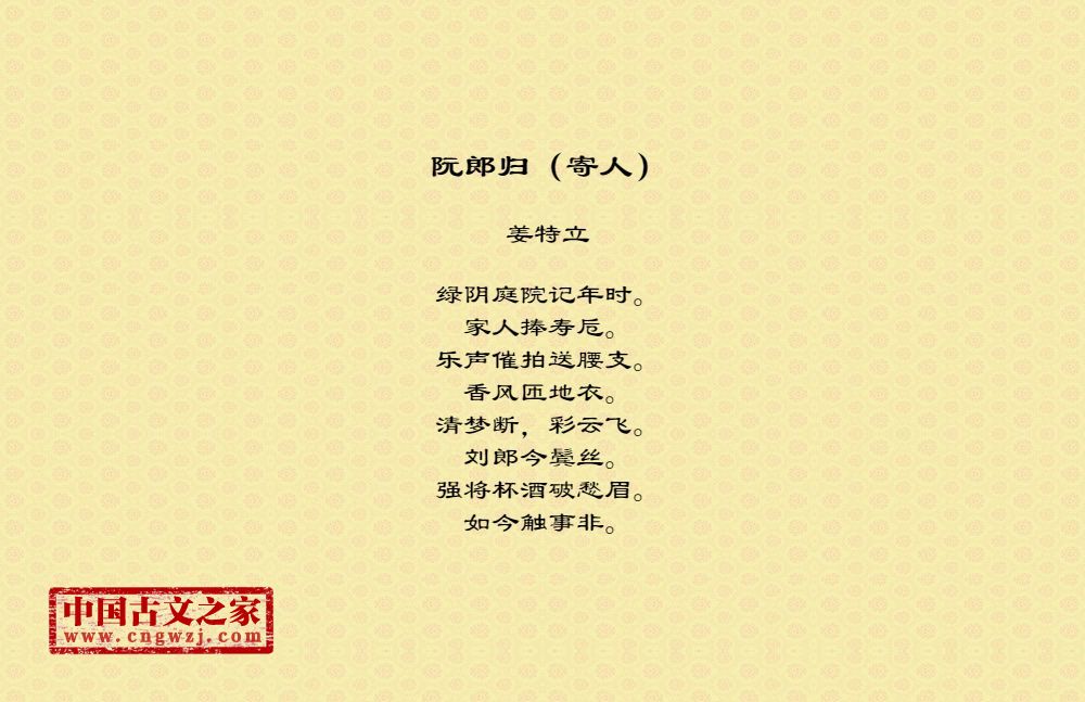 绿阴庭院记年时。家人捧寿卮。乐声催拍送腰支。香风匝地衣。清梦断,彩云飞。刘郎今鬓丝。强将杯酒破愁眉。如今触事非。