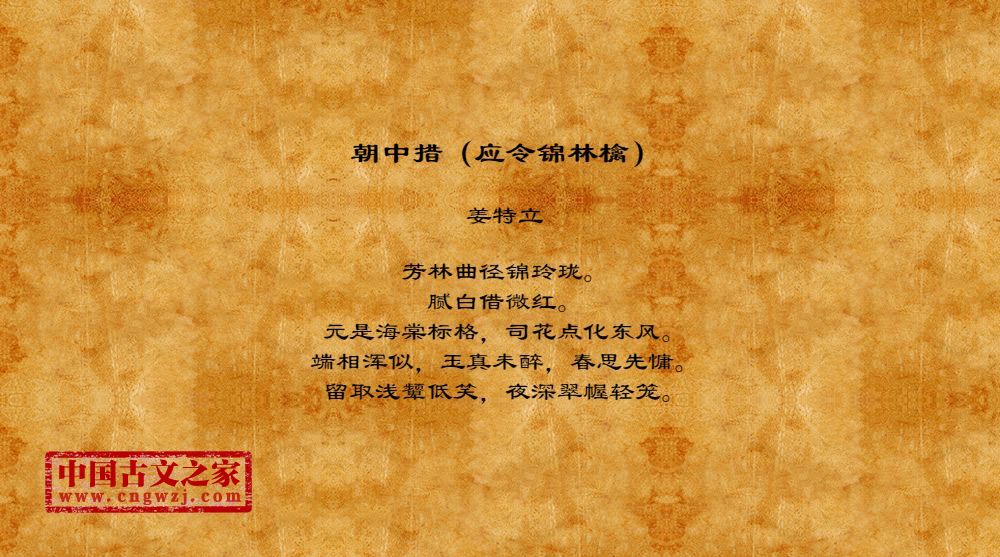 芳林曲径锦玲珑。腻白借微红。元是海棠标格,司花点化东风。端相浑似,玉真未醉,春思先慵。留取浅颦低笑,夜深翠幄轻笼。