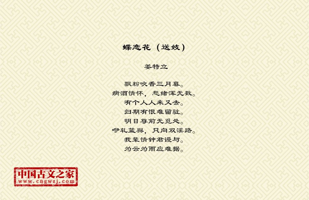 飘粉吹香三月暮。病酒情怀,愁绪浑无数。有个人人来又去。归期有恨难留驻。明日尊前无觅处。咿轧篮舆,只向双溪路。我辈情钟君谩与。为云为雨应难据。