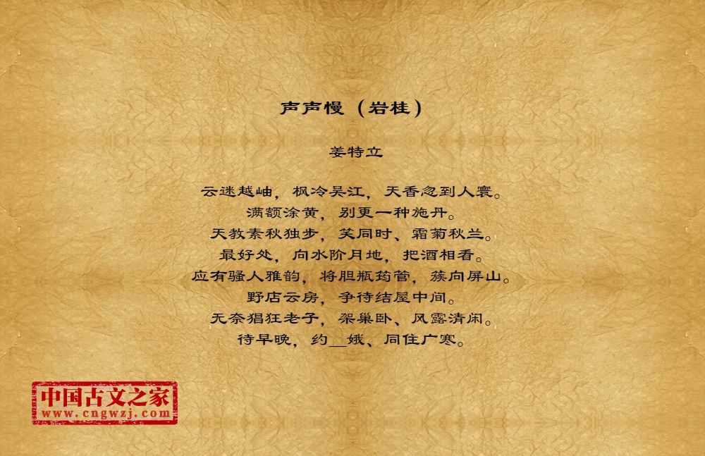 云迷越岫,枫冷吴江,天香忽到人寰。满额涂黄,别更一种施丹。天教素秋独步,笑同时、霜菊秋兰。最好处,向水阶月地,把酒相看。应有骚人雅韵,将胆瓶筠管,簇向屏山。野店云房,争待结屋中间。无奈猖狂老子,架巢卧、风露清闲。待早晚,约_娥、同住广寒。