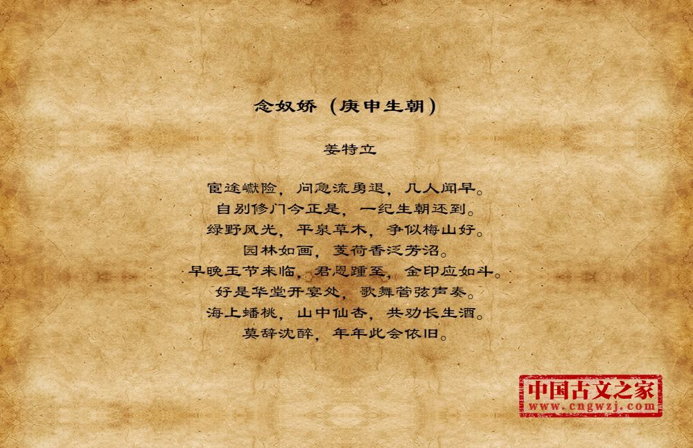 姜特立[公元?年至一一九二年左右],字邦杰,浙江丽水人。生年不详,卒于宋光宗绍熙中。以父恩补承信郎。淳熙中,(公元一一八一年左右)累迁福建兵马副都监;
