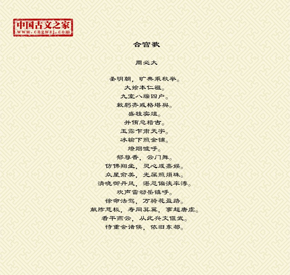圣明朝,旷典乘秋举。大飨本仁祖。九室八牖四户。敕躬齐戒格堪舆。盛牲实俎。并侑总稽古。玉露乍肃天宇。冰输下照金铺。燎烟嘘呼。郁尊香,云门舞。仿佛翔坐,灵心咸嘉娱。众星俞美,光属照熉珠。清晓御丹凤,湛恩偏浃率溥。欢声雷动岳镇呼。徐命法驾,万骑花盈路。献胙慈极,寿同箕翼,事超唐虞。看平燕云,从此兴文偃武。待重会诸侯,依旧东都。