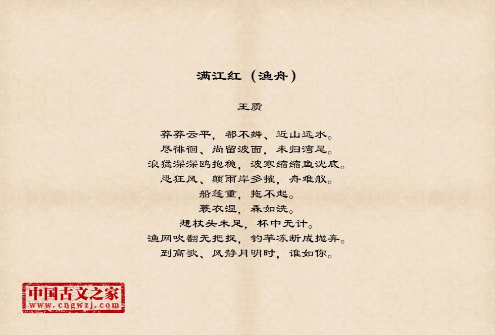 莽莽云平,都不辨、近山远水。尽徘徊、尚留波面,未归湾尾。浪猛深深鸥抱稳,波寒缩缩鱼沈底。恐狂风、颠雨岸多摧,舟难舣。船篷重,拖不起。蓑衣湿,森如洗。想杖头未足,杯中无计。渔网吹翻无把捉,钓竿冻断成抛弃。到高歌、风静月明时,谁如你。