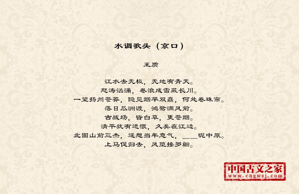 江水去无极,无地有青天。怒涛汹涌,卷浪成雪蔽长川。一望扬州苍莽,隐见烟竿双矗,何处卷珠帘。落日瓜洲渡,鸿鹭满风前。古战场,皆白草,更苍烟。清平犹有遗恨,久矣在江边。北固山前三杰,遥想当年意气,__昵中原。上马促归去,风堕接罗翩。