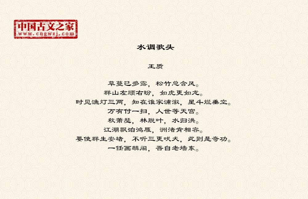草蔓已多露,松竹总含风。群山左顾右盼,如虎更如龙。时见渔灯三两,知在谁家浦溆,星斗烂垂空。万有付一扫,人世等天宫。秋萧瑟,林脱叶,水归洪。江湖飘泊鸿雁,洲渚肯相容。要使群生安堵,不听三更吠犬,此则是奇功。一任画麟阁,吾自老墙东。