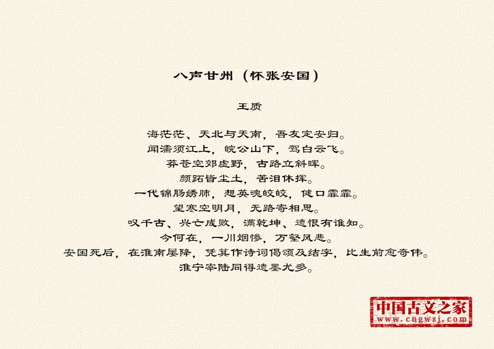 海茫茫、天北与天南,吾友定安归。闻濡须江上,皖公山下,驾白云飞。莽苍空郊虚野,古路立斜晖。颜跖皆尘土,苦泪休挥。一代锦肠绣肺,想英魂皎皎,健口霏霏。望寒空明月,无路寄相思。叹千古、兴亡成败,满乾坤、遗恨有谁知。今何在,一川烟惨,万壑风悲。安国死后,在淮南屡降,凭箕作诗词偈颂及结字,比生前愈奇伟。淮宁宰陆同得遗墨尤多。