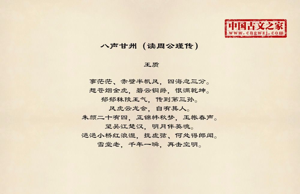 事茫茫、赤壁半帆风,四海忽三分。想苍烟金虎,碧云铜爵,恨满乾坤。郁郁秣陵王气,传到第三孙。风虎云龙会,自有其人。朱颜二十有四,正锦帏秋梦,玉帐春声。望吴江楚汉,明月伴英魂。浥浥小桥红浪湿,抚虚弦、何处得郎闻。雪堂老,千年一瞬,再击空明。