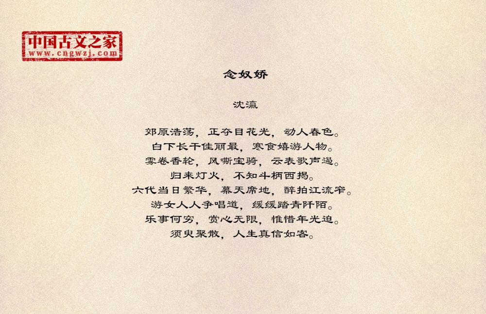 郊原浩荡,正夺目花光,动人春色。白下长干佳丽最,寒食嬉游人物。雾卷香轮,风嘶宝骑,云表歌声遏。归来灯火,不知斗柄西揭。六代当日繁华,幕天席地,醉拍江流窄。游女人人争唱道,缓缓踏青阡陌。乐事何穷,赏心无限,惟惜年光迫。须臾聚散,人生真信如客。