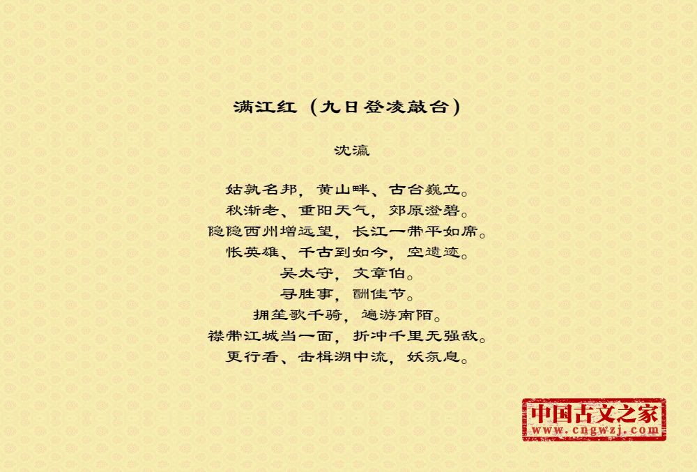 姑孰名邦,黄山畔、古台巍立。秋渐老、重阳天气,郊原澄碧。隐隐西州增远望,长江一带平如席。怅英雄、千古到如今,空遗迹。吴太守,文章伯。寻胜事,酬佳节。拥笙歌千骑,遍游南陌。襟带江城当一面,折冲千里无强敌。更行看、击楫溯中流,妖氛息。
