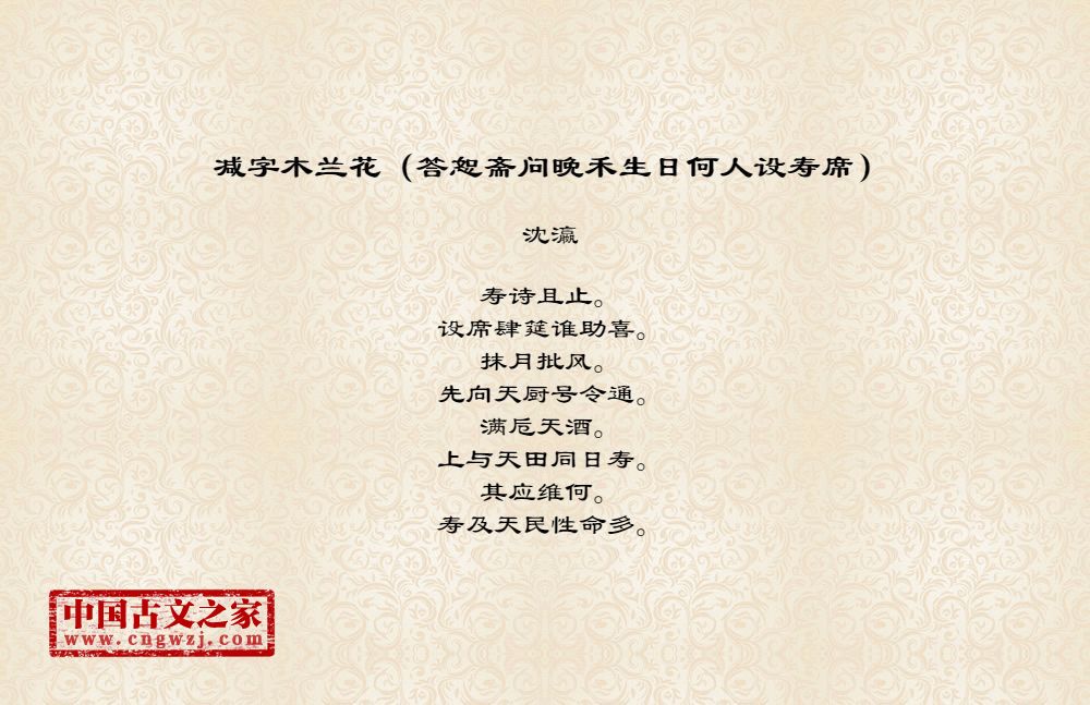 《减字木兰花(答恕斋问晚禾生日何人设寿席)》由沈瀛创作
