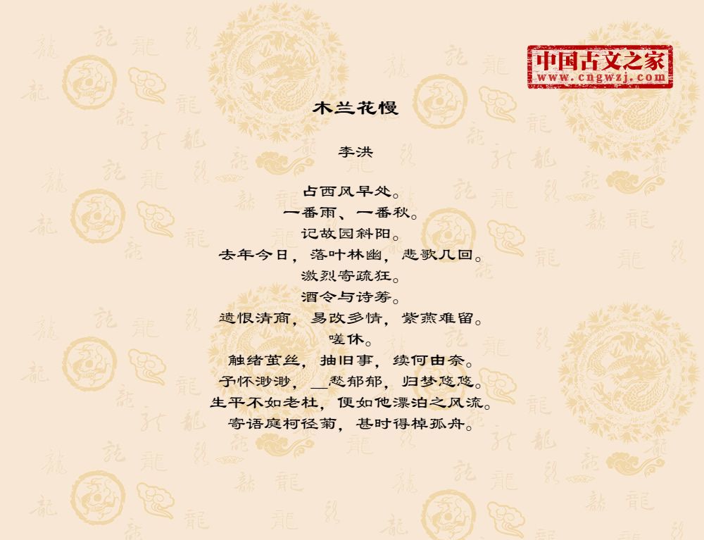 占西风早处。一番雨、一番秋。记故园斜阳。去年今日,落叶林幽,悲歌几回。激烈寄疏狂。酒令与诗筹。遗恨清商,易改多情,紫燕难留。嗟休。触绪茧丝,抽旧事,续何由奈。予怀渺渺,_愁郁郁,归梦悠悠。生平不如老杜,便如他漂泊之风流。寄语庭柯径菊,甚时得棹孤舟。