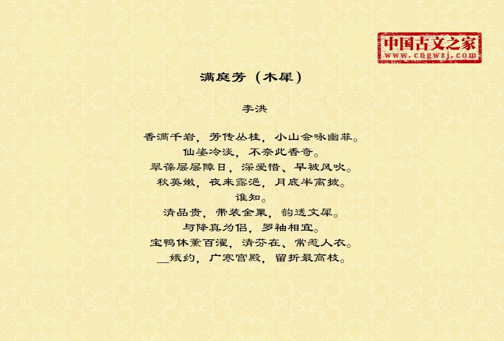香满千岩,芳传丛桂,小山会咏幽菲。仙姿冷淡,不奈此香奇。翠葆层层障日,深爱惜、早被风吹。秋英嫩,夜来露浥,月底半离披。谁知。清品贵,带装金粟,韵透文犀。与降真为侣,罗袖相宜。宝鸭休薰百濯,清芬在、常惹人衣。_娥约,广寒宫殿,留折最高枝。