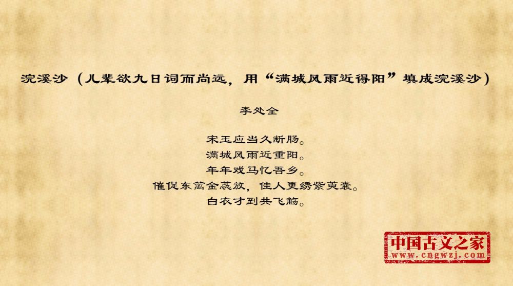 《浣溪沙(儿辈欲九日词而尚远,用“满城风雨近得阳”填成浣溪沙)》由李处全创作