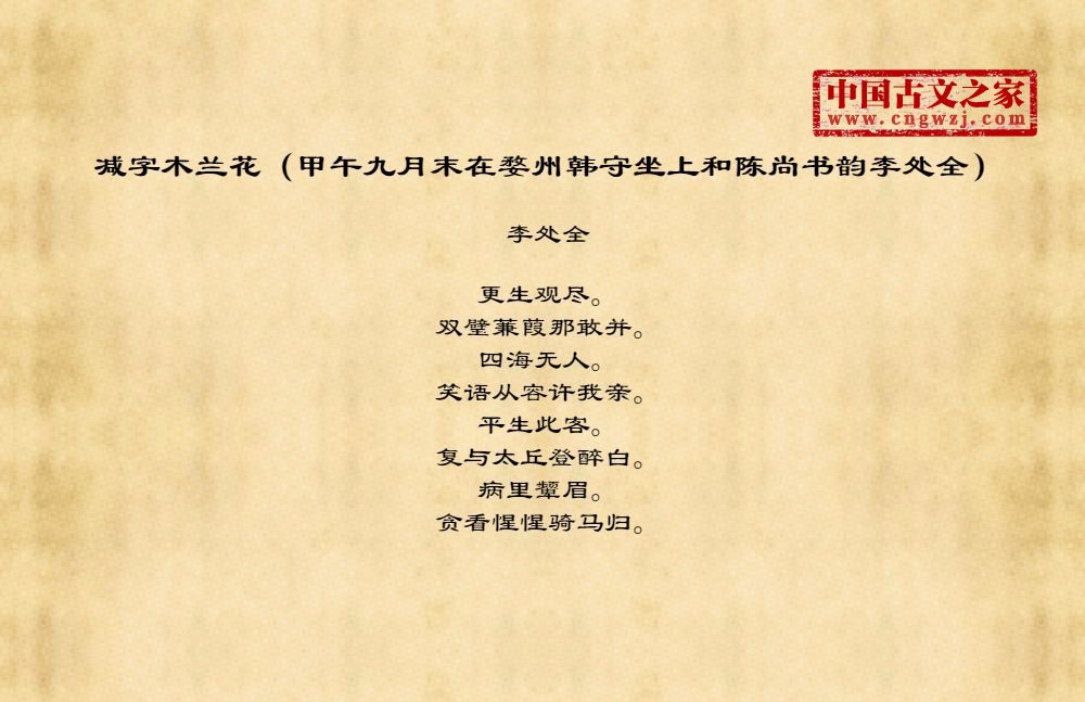 减字木兰花(甲午九月末在婺州韩守坐上和陈尚书韵李处全)