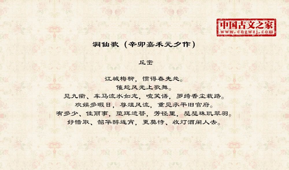 江城梅柳,惯得春先处。催趁风光上歌舞。见九衢、车马流水如龙,喧笑语,罗绮香尘载路。欢娱多暇日,尊俎风流,重见承平旧官府。有多少、佳丽事,堕珥遗簪,芳径里,瑟瑟珠玑翠羽。好惜取、韶华醉连宵,更莫待、收灯酒阑人去。