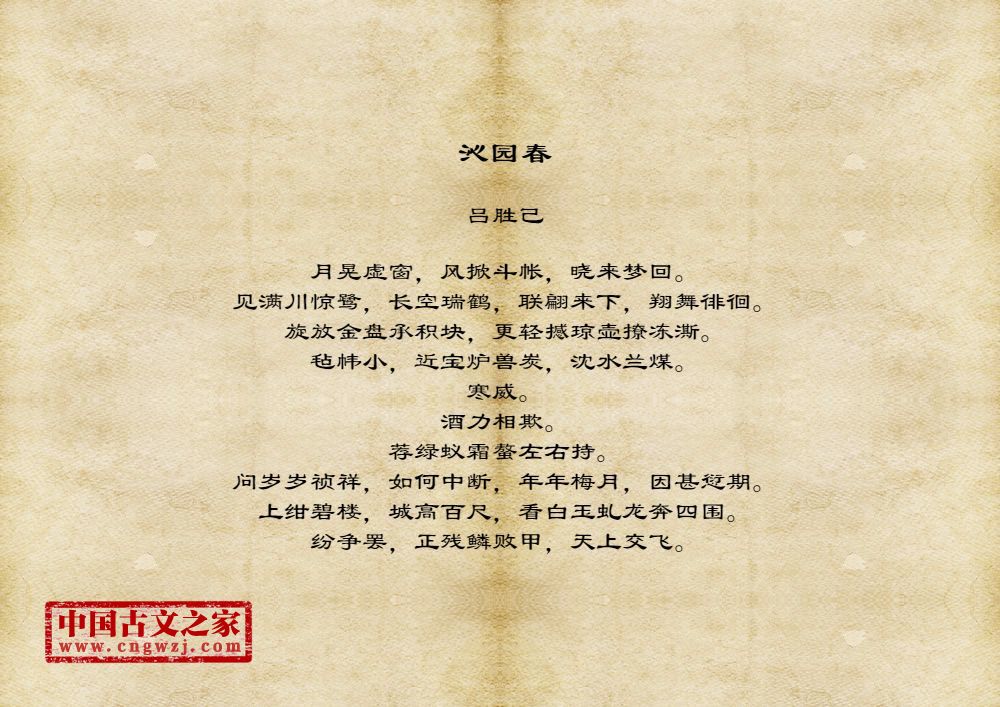 月晃虚窗,风掀斗帐,晓来梦回。见满川惊鹭,长空瑞鹤,联翩来下,翔舞徘徊。旋放金盘承积块,更轻撼琼壶撩冻澌。毡帏小,近宝炉兽炭,沈水兰煤。寒威。酒力相欺。荐绿蚁霜螯左右持。问岁岁祯祥,如何中断,年年梅月,因甚愆期。上绀碧楼,城高百尺,看白玉虬龙奔四围。纷争罢,正残鳞败甲,天上交飞。