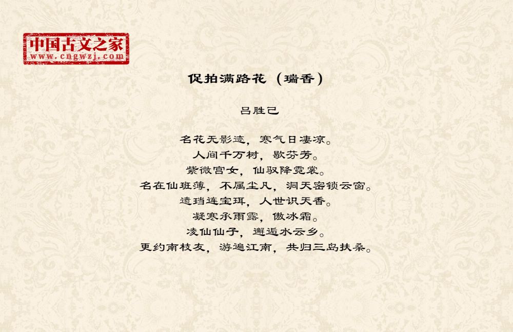 名花无影迹,寒气日凄凉。人间千万树,歇芬芳。紫微宫女,仙驭降霓裳。名在仙班簿,不属尘凡,洞天密锁云窗。遗珰连宝珥,人世识天香。凝寒承雨露,傲冰霜。凌仙仙子,邂逅水云乡。更约南枝友,游遍江南,共归三岛扶桑。