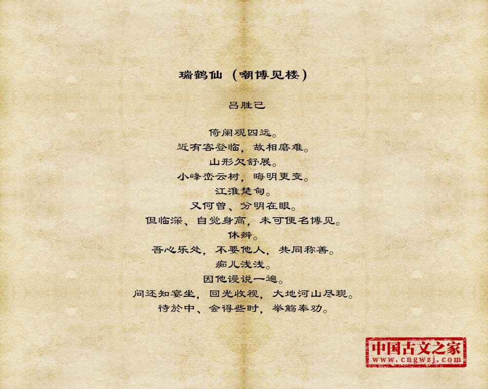 倚阑观四远。近有客登临,故相磨难。山形欠舒展。小峰峦云树,晦明更变。江淮楚甸。又何曾、分明在眼。但临深、自觉身高,未可便名博见。休辨。吾心乐处,不要他人,共同称善。痴儿浅浅。因他谩说一遍。问还知宴坐,回光收视,大地河山尽现。待於中、会得些时,举觞奉劝。