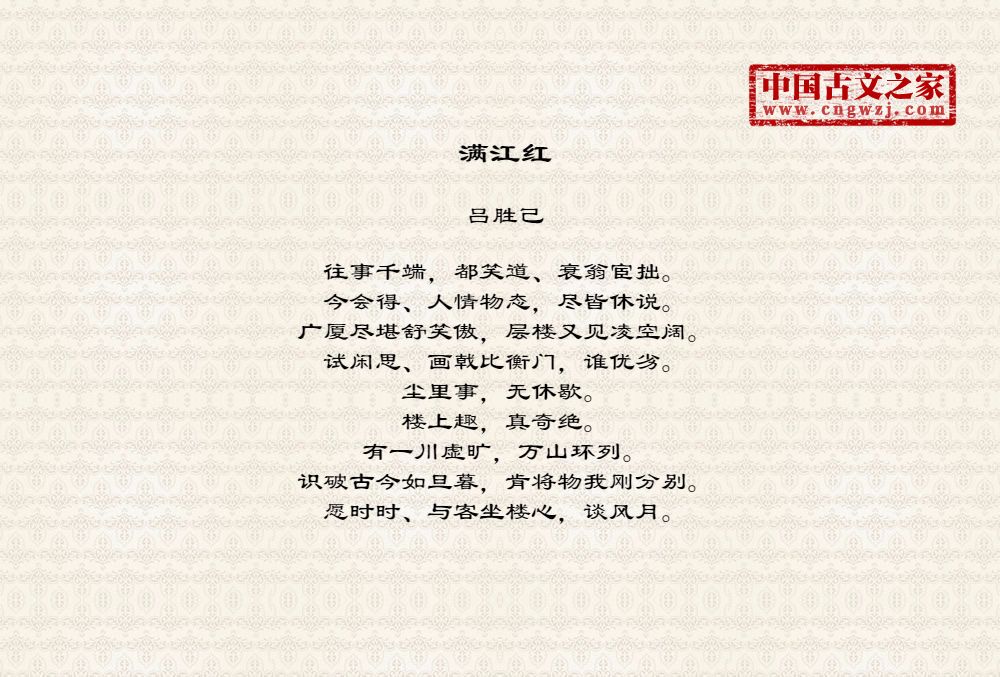 往事千端,都笑道、衰翁宦拙。今会得、人情物态,尽皆休说。广厦尽堪舒笑傲,层楼又见凌空阔。试闲思、画戟比衡门,谁优劣。尘里事,无休歇。楼上趣,真奇绝。有一川虚旷,万山环列。识破古今如旦暮,肯将物我刚分别。愿时时、与客坐楼心,谈风月。