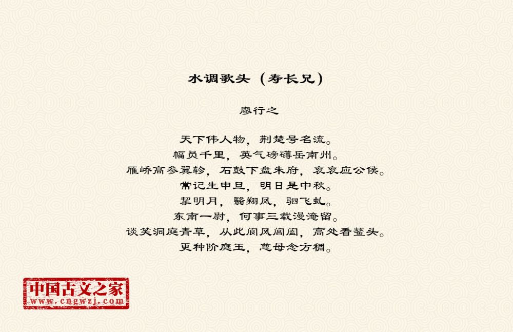 天下伟人物,荆楚号名流。幅员千里,英气磅礴岳南州。雁峤高参翼轸,石鼓下盘朱府,衮衮应公侯。常记生申旦,明日是中秋。挈明月,翳翔凤,驷飞虬。东南一尉,何事三载漫淹留。谈笑洞庭青草,从此阆风阊阖,高处看鳌头。更种阶庭玉,慈母念方稠。