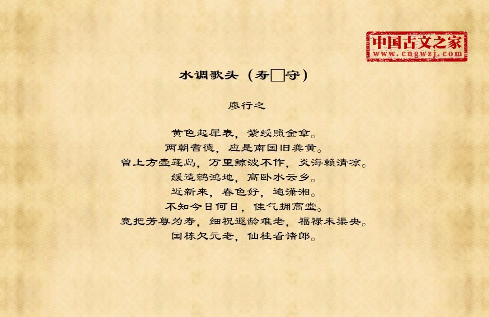 黄色起犀表,紫绶照金章。两朝耆德,应是南国旧龚黄。曾上方壶蓬岛,万里鲸波不作,炎海赖清凉。缓造鹓鸿地,高卧水云乡。近新来,春色好,遍潇湘。不知今日何日,佳气拥高堂。竞把芳尊为寿,细祝遐龄难老,福禄未渠央。国栋欠元老,仙桂看诸郎。