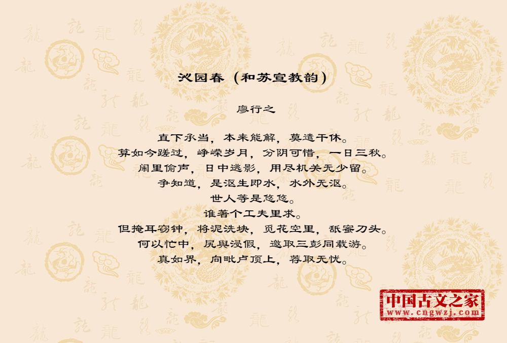 直下承当,本来能解,莫遣干休。算如今蹉过,峥嵘岁月,分阴可惜,一日三秋。闹里偷声,日中逃影,用尽机关无少留。争知道,是沤生即水,水外无沤。世人等是悠悠。谁著个工夫里求。但掩耳窃钟,将泥洗块,觅花空里,舐蜜刀头。何以忙中,尻舆浸假,邀取三彭同载游。真如界,向毗卢顶上,荐取无忧。