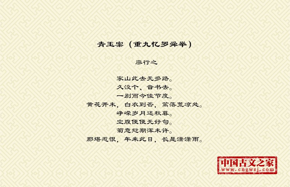 家山此去无多路。久没个、音书去。一别而今佳节度。黄花开未,白衣到否,篱落荒凉处。峥嵘岁月还秋暮。空腹便便无好句。菊意愆期浑未许。那堪惹恨,年来此日,长是潇潇雨。