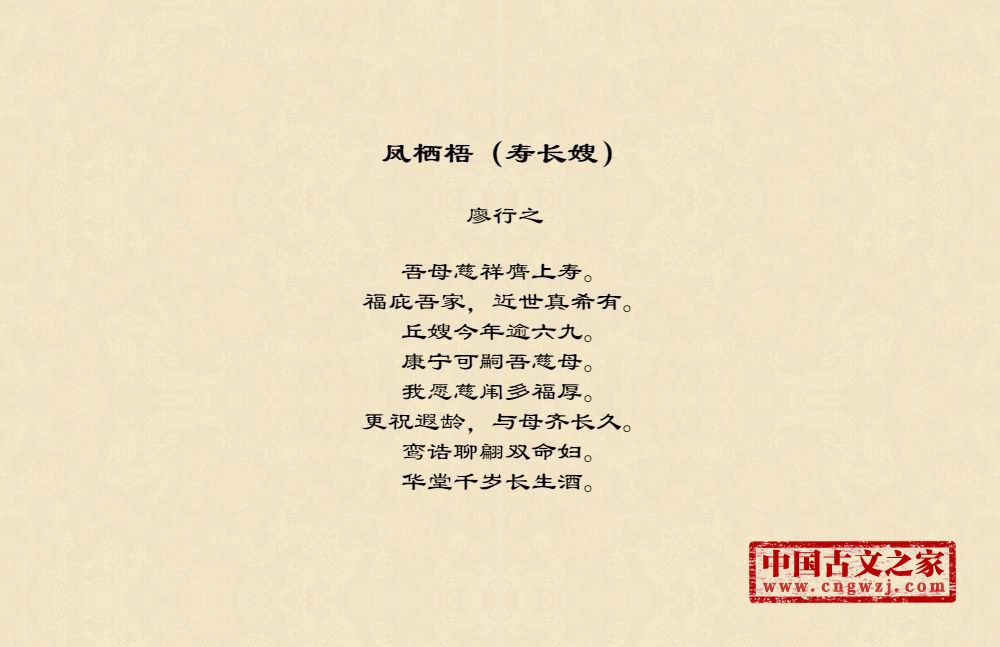 吾母慈祥膺上寿。福庇吾家,近世真希有。丘嫂今年逾六九。康宁可嗣吾慈母。我愿慈闱多福厚。更祝遐龄,与母齐长久。鸾诰聊翩双命妇。华堂千岁长生酒。