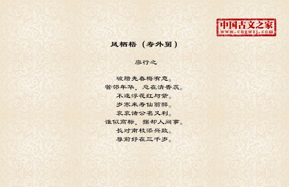 破腊先春梅有意。管邻年华,总在清香蕊。不逐浮花红与紫。岁寒来寿仙翁醉。衮衮诸公名又利。谁似高标,摆却人间事。长对南枝添兴致。尊前好在三千岁。