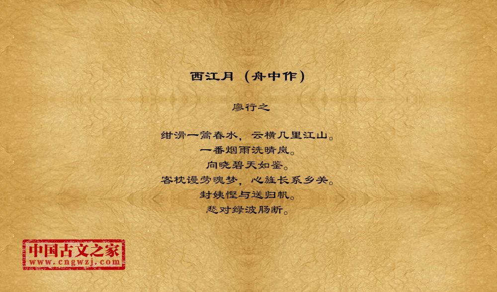 绀滑一篙春水,云横几里江山。一番烟雨洗晴岚。向晓碧天如鉴。客枕谩劳魂梦,心旌长系乡关。封姨慳与送归帆。愁对绿波肠断。