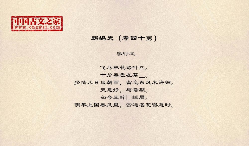 飞尽林花绿叶丝。十分春色在荼_。多情几日风朝雨,留恋东风未许归。天意好,与君期。如今且醉□蛾眉。明年上国春风里,赏遍名花得意时。