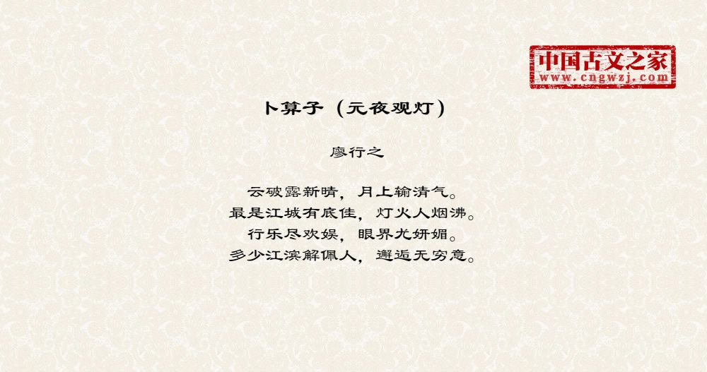 云破露新晴,月上输清气。最是江城有底佳,灯火人烟沸。行乐尽欢娱,眼界尤妍媚。多少江滨解佩人,邂逅无穷意。